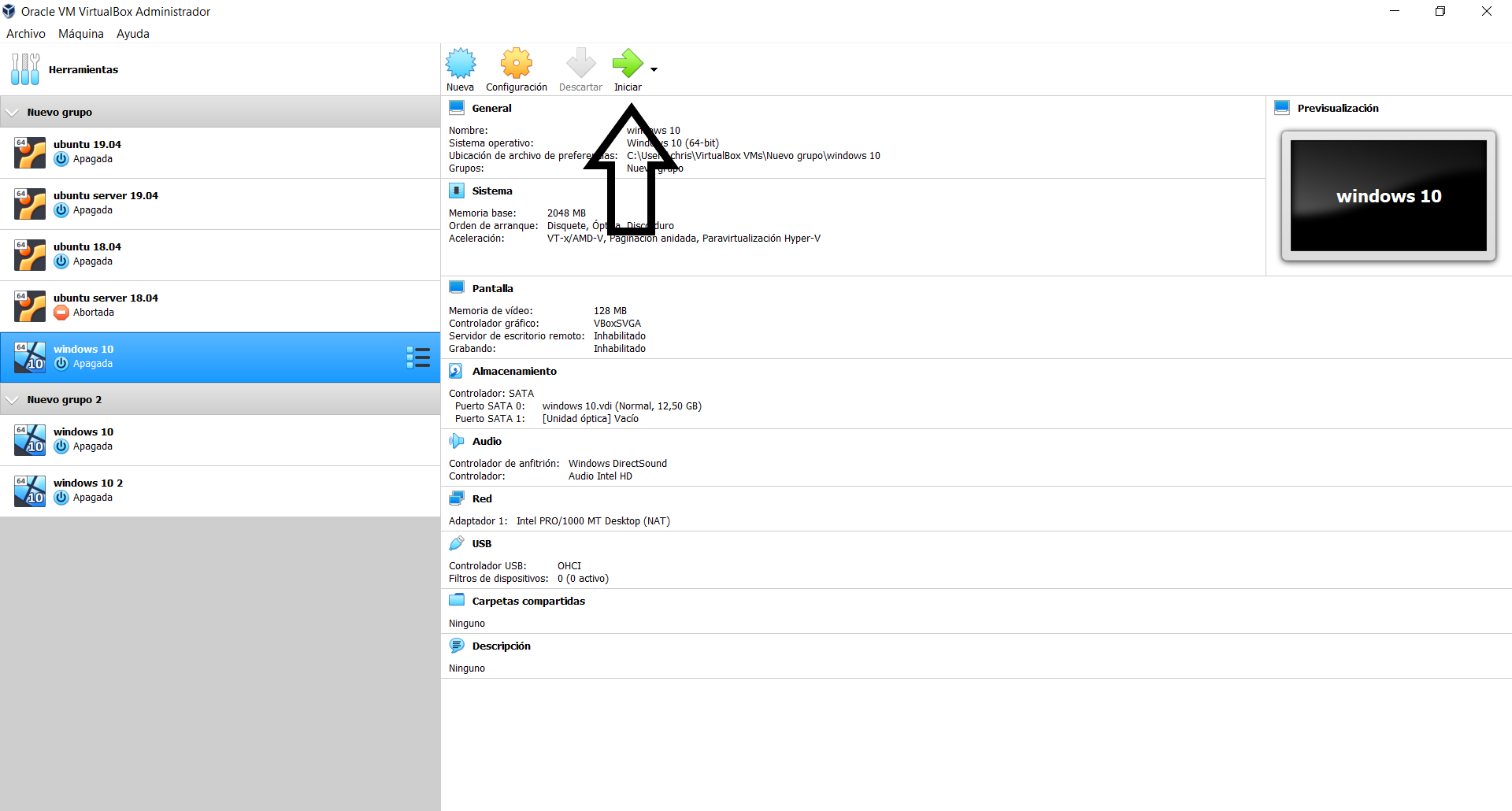Ahora nos toca iniciar la maquina virtual, clicamos iniciar a la maquina virtual que hemos creado.